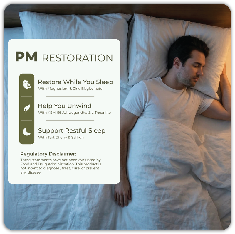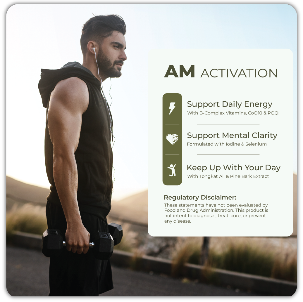 A two-phase Men’s Multivitamin and Performance Formula — AM for energy and focus, PM for recovery and sleep optimization.