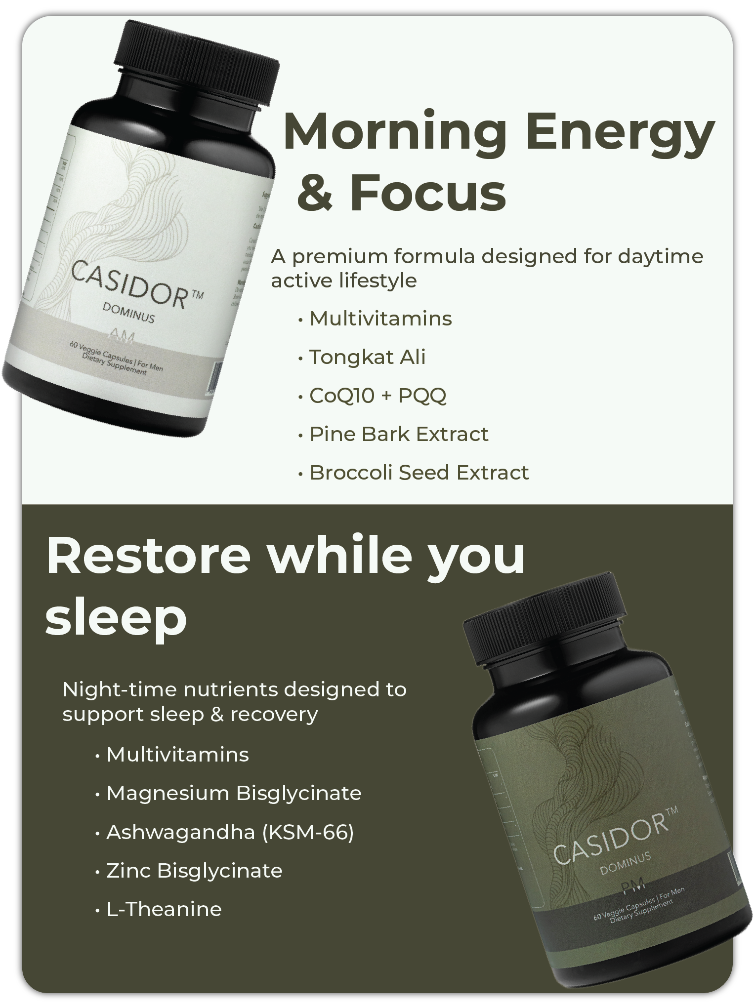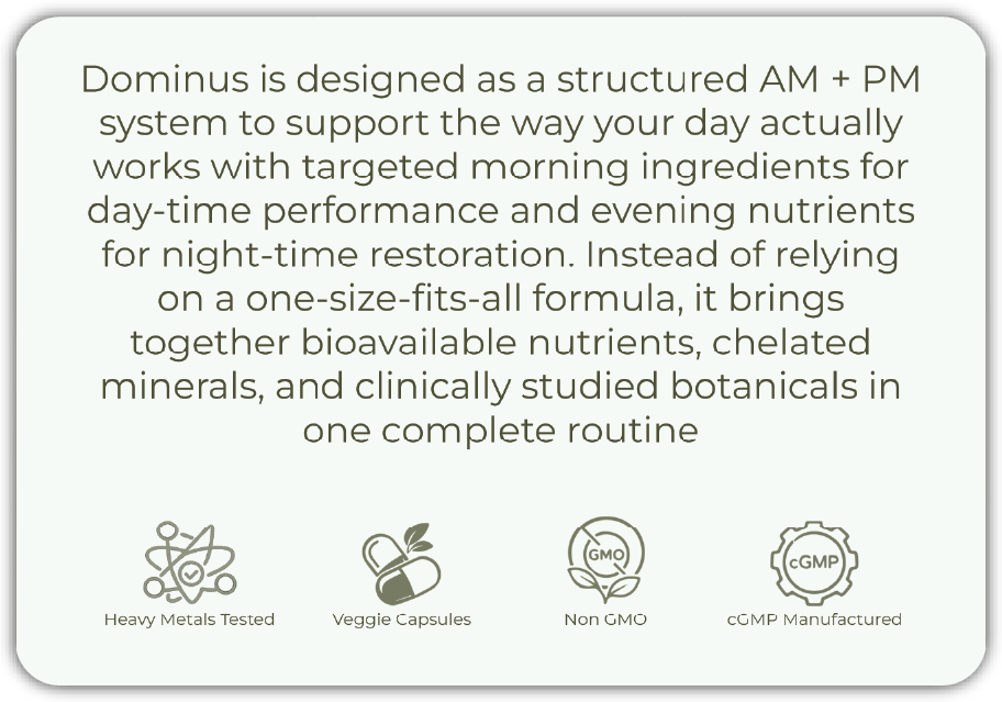 CASIDOR DOMINUS replaces that approach with one integrated AM + PM system—built around how the body shifts from day output to night restoration.